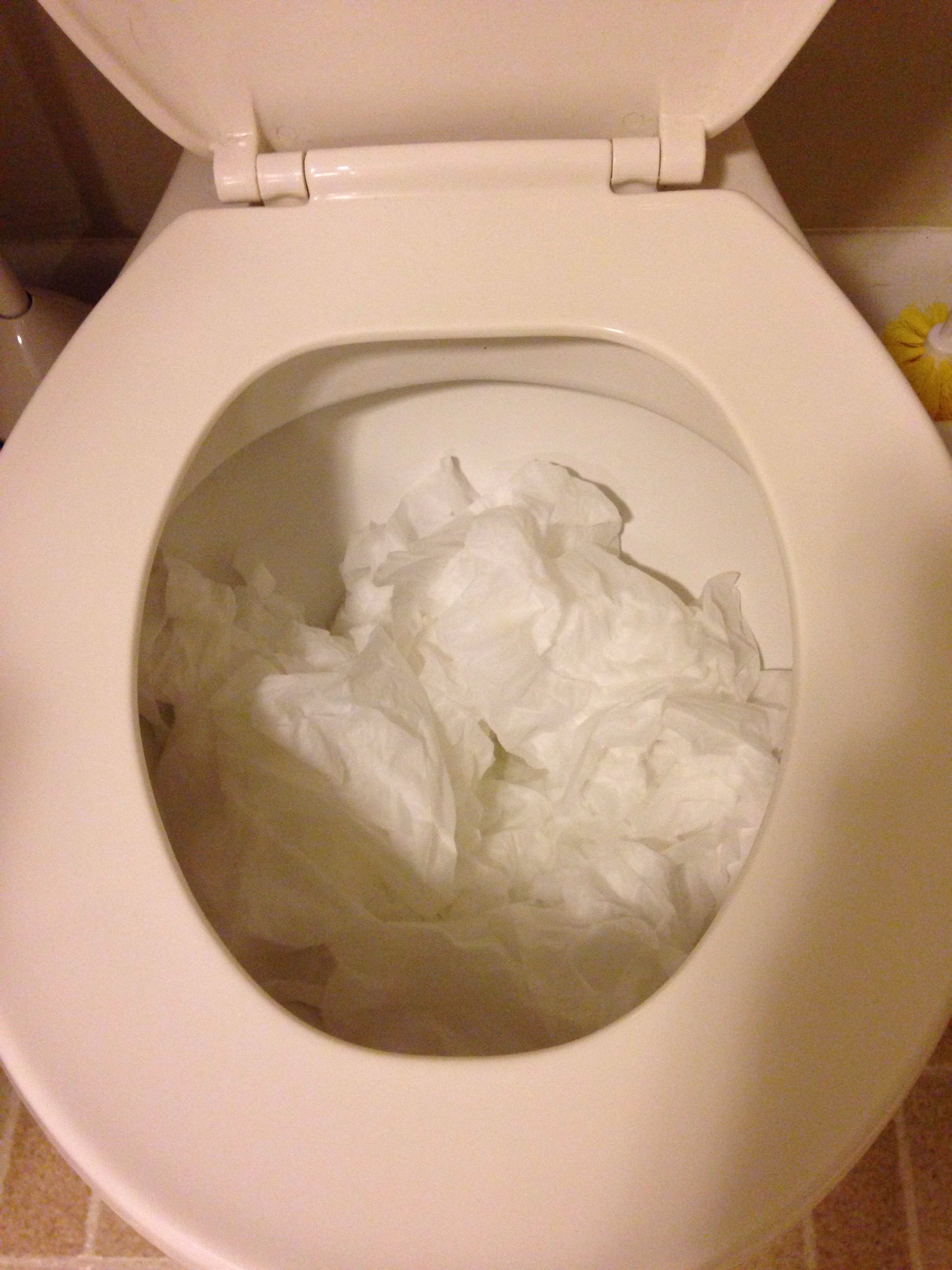 yes, that is a toilet bowl. Yes, it is chock full of toilet paper. The basement bathroom we rarely use isn’t a typical place for my daughter to hang out, but she managed to sneak in, unroll half a roll of toilet paper, and fill up the toilet. Most surprising thing? It flushed right down with no problem. Thankfully.