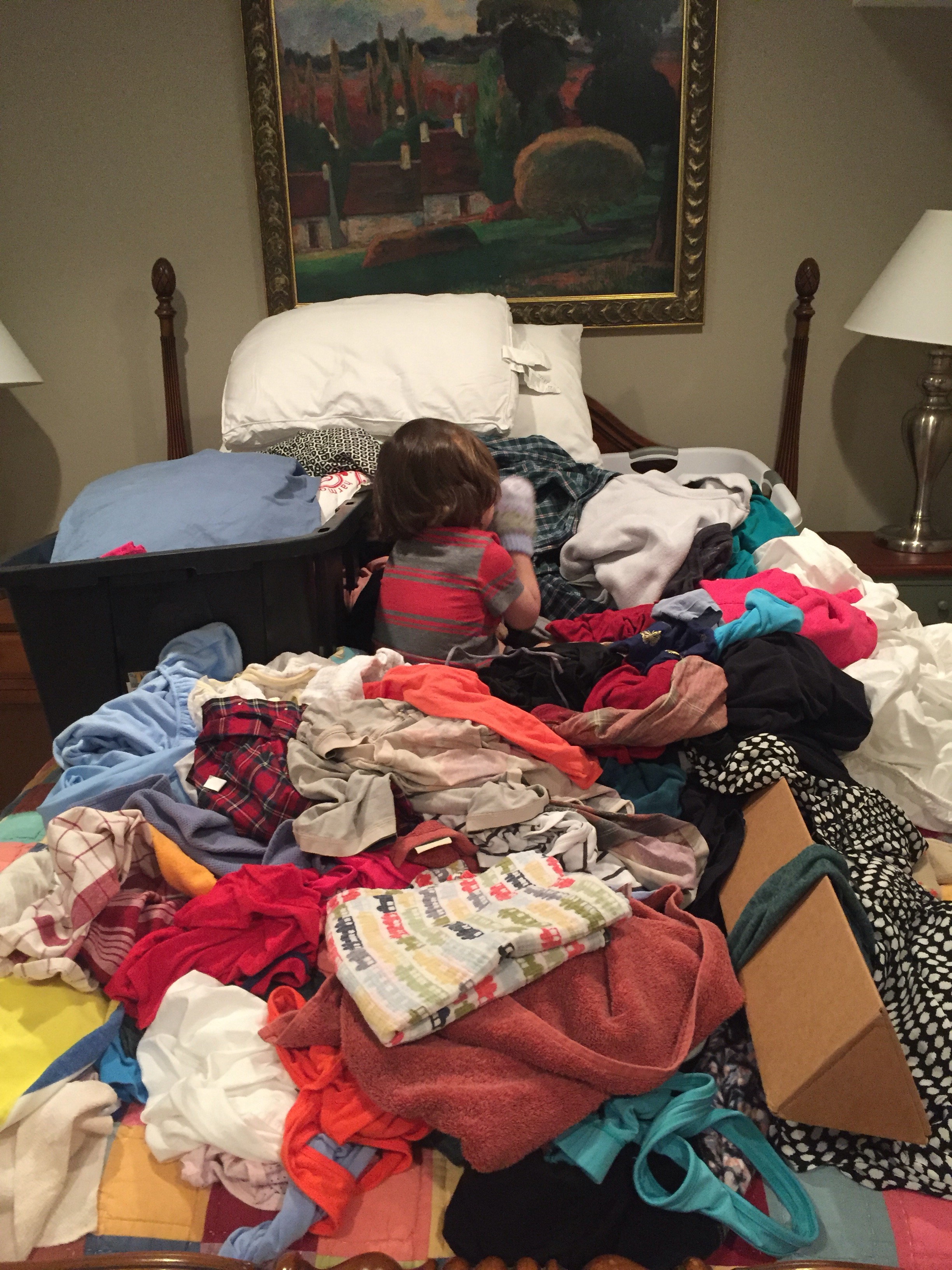I go into the spare bedroom (where we dump the laundry) and see this: