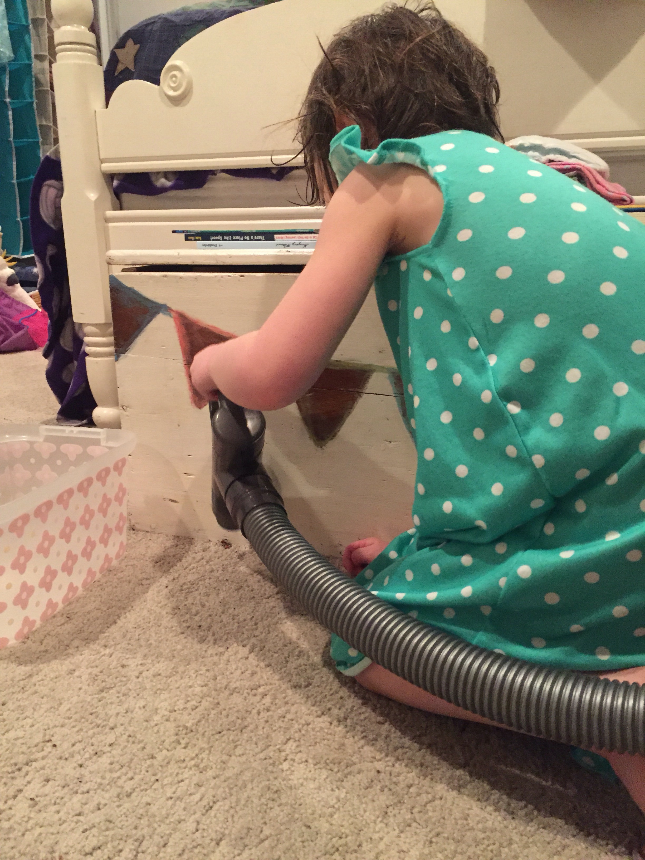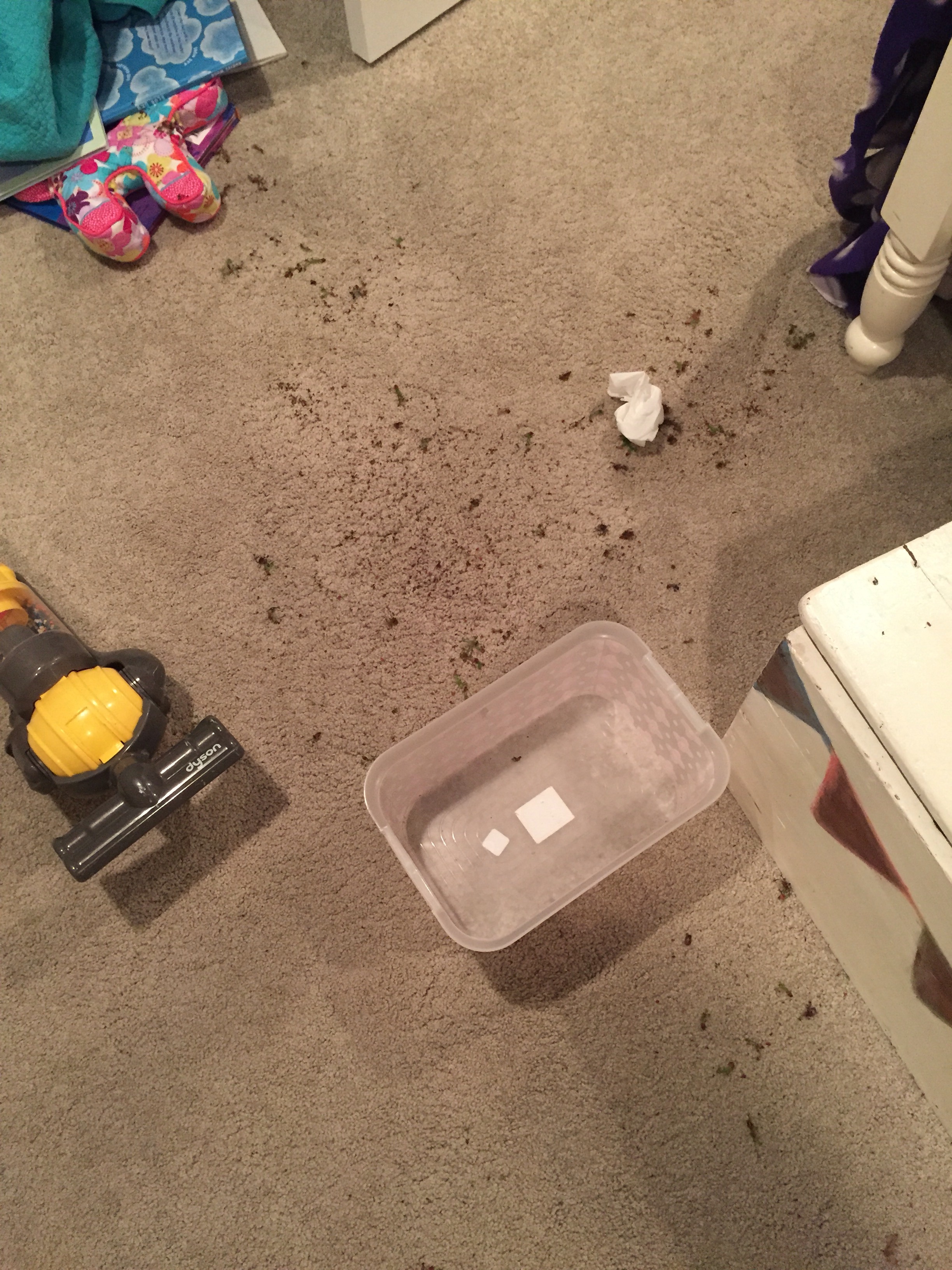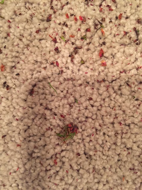 It’s basically a bunch of leaves/weeds/buds off a tree in our yard that she at some point brought inside. And then sorta ground into the carpet. It’s even a little funnier because of the toy vacuum sitting next to it like she’d tried to clean it up with that.