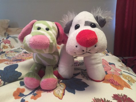 Hubby was still in the bed when J was reaching down in between the bed and the wall. He heard him mumbling about “I’ll get your sister!” and “Almost there! I can almost reach her!” Finally after much struggling, Hubby realized that he had dropped something. He was holding the Christmas dog, but had dropped “his sister” behind the bed and couldn’t get her out. Here are the puppy siblings: