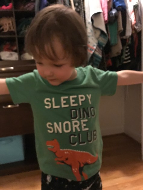J, above: I have a dino-snore on my shirt! Like Daddy snores!