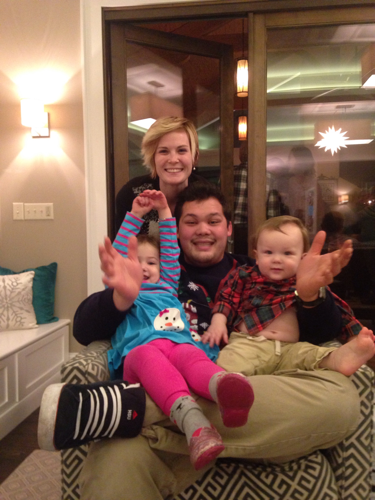 Hubby busted out a tacky sweatshirt, so I ran over to Goodwill and scored that amazing vest. $3, thank you very much! And the kiddos were all decked out in festive attire, so we decided to get a family photo! You see how well it worked out…