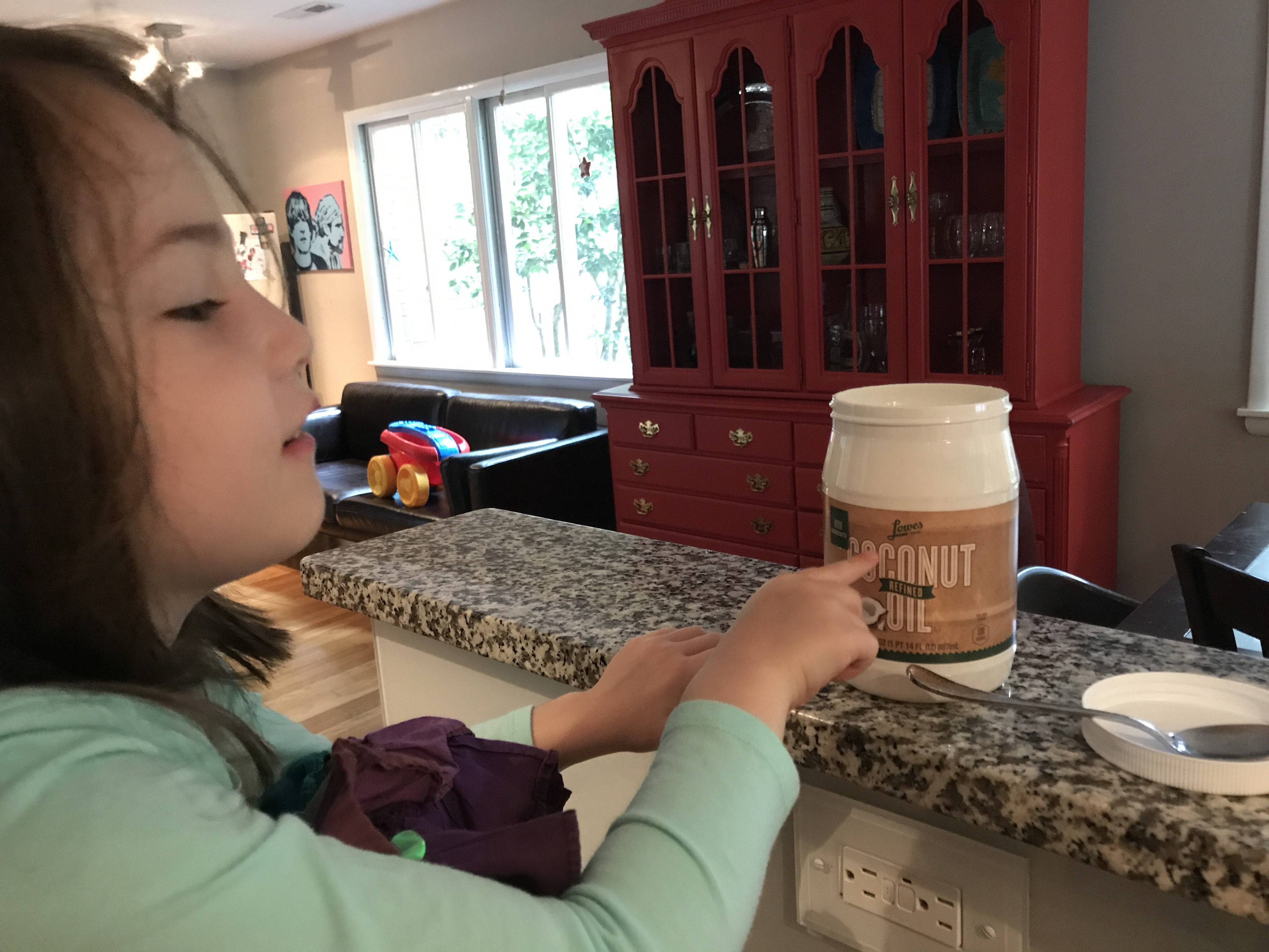EK pointing to the store-brand coconut oil: I know where that came from! The grocery store! Because I see the letters for the store!
