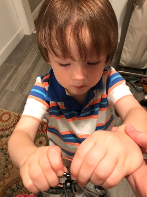 D, potty training naked, toots, then looks behind him on the floor, sees a piece of a brown leaf: Mom!! Pick up that toot!