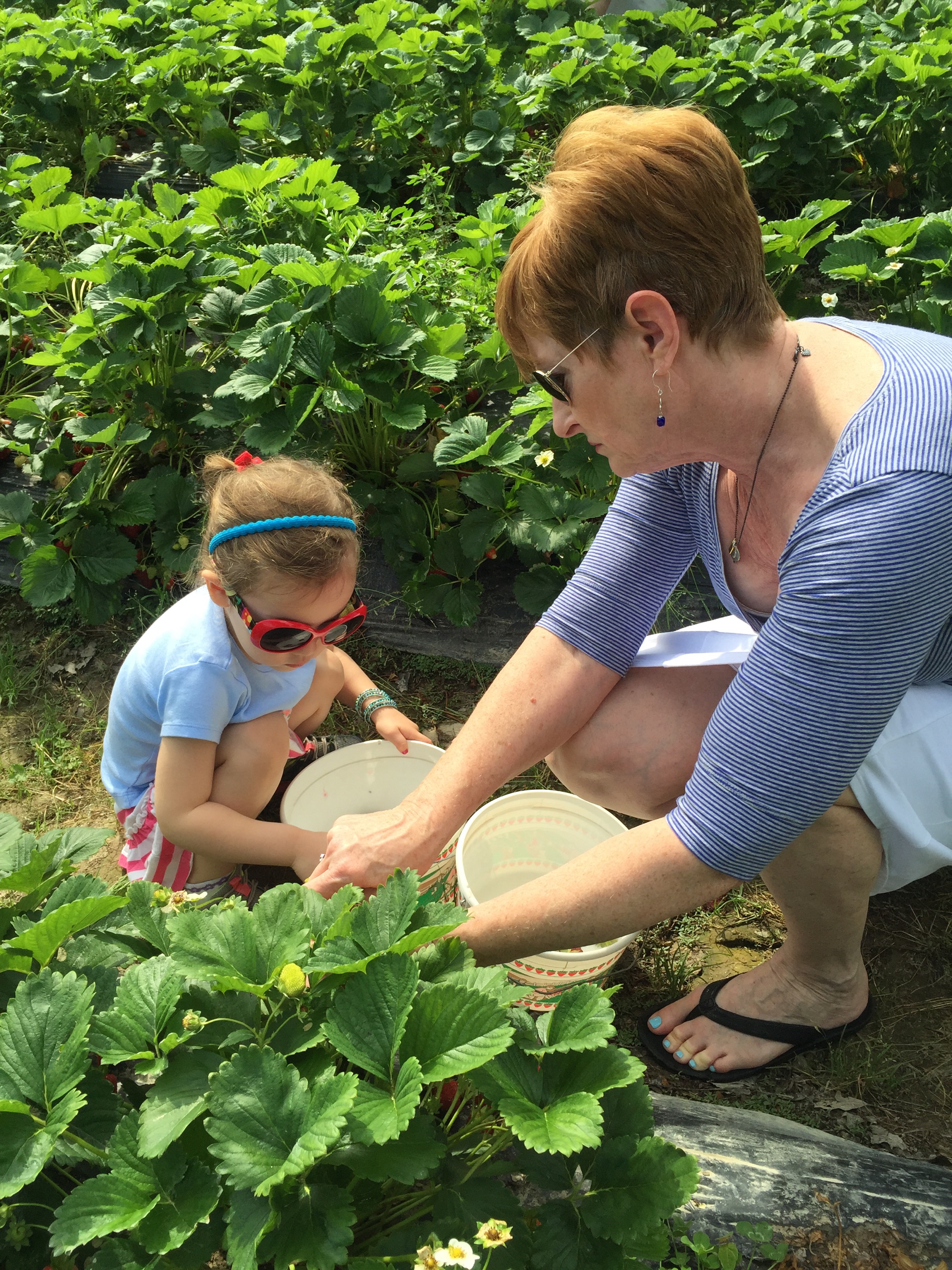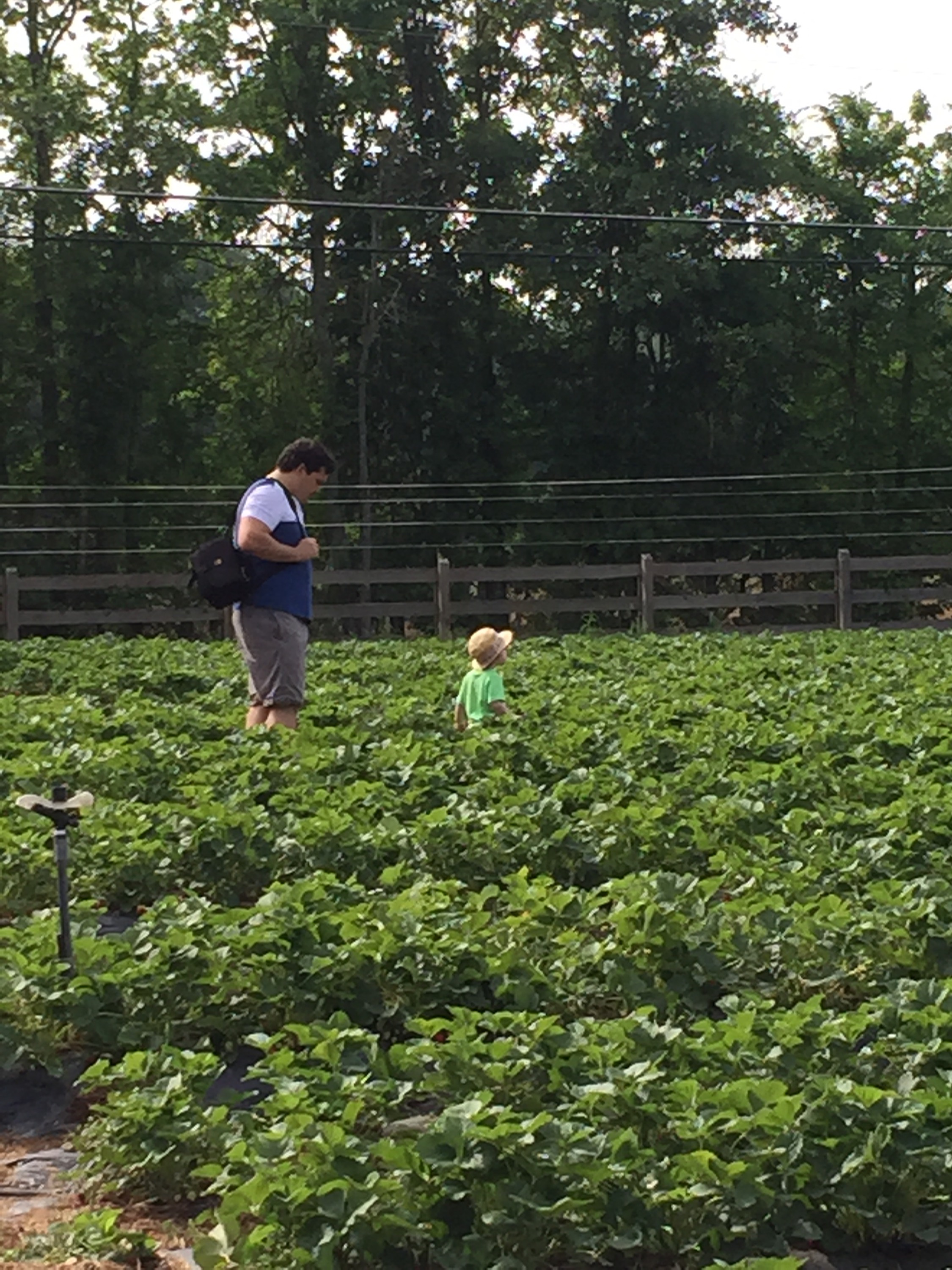 The only moment on the way to my parents’ house that was peaceful.Couldn’t get them smiling, but my cuties were enjoying some snuggles with Nana (my maternal grandmother)Kisses for Nana!EK is like a fish.My dad and J, relaxing like bosses.A sweet moment at the strawberry patch before they started fighting.They might have been small, but they were packed with flavor! Yum!EK helping my mom fill her bucket.My boys wandering among the strawberries. (I can’t get over J actually wearing that straw hat!)Hubs snapped this one while I wasn’t looking. It might be one of my favorites of the two of us ever.